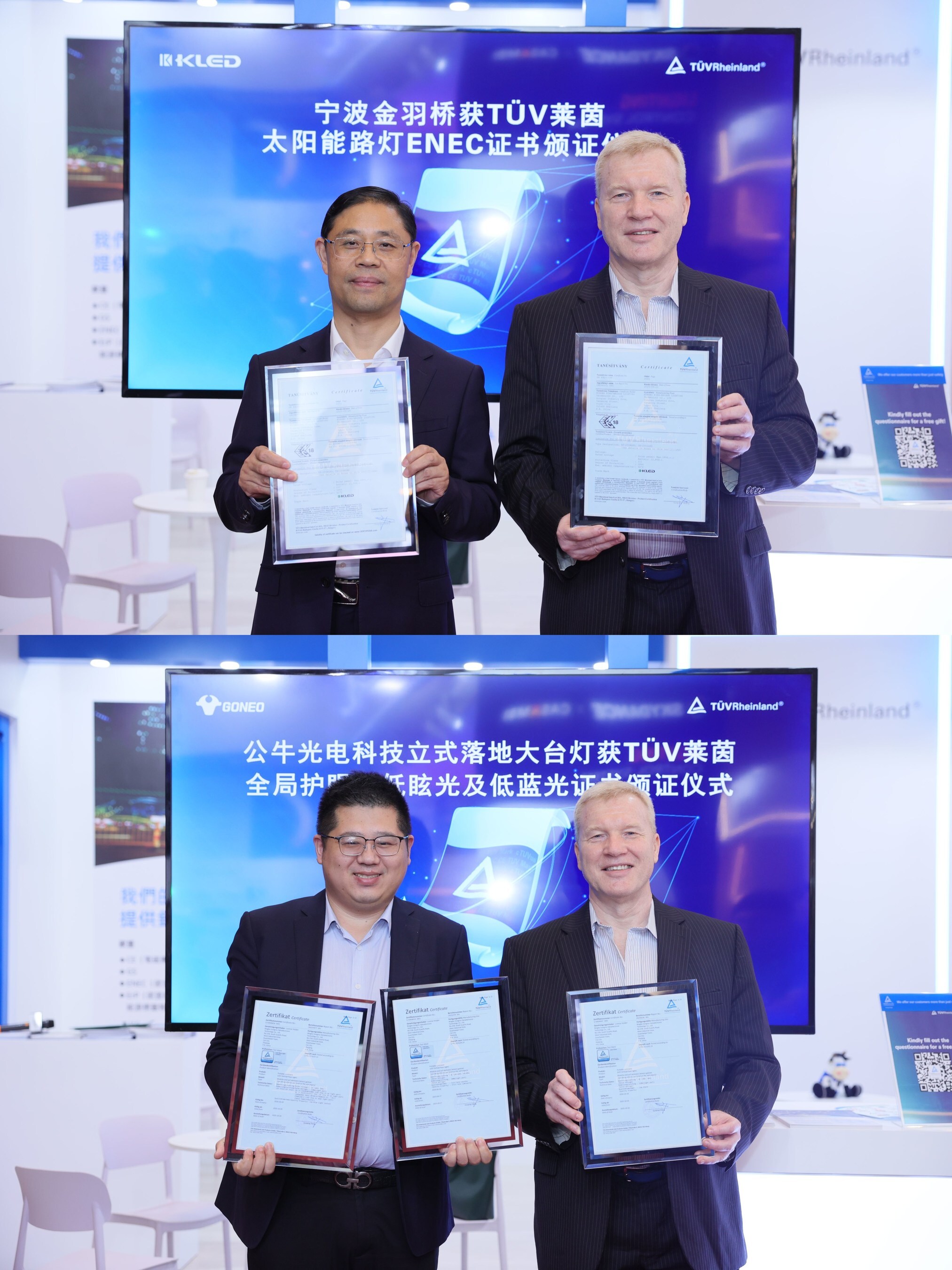 香港2025年10月31日 /美通社/ -- 10月27-30日,国际独立第三方检测、检验和认证机构德国莱茵TÜV大中华区(简称"TÜV莱茵")亮相2025香港国际秋季灯饰展。展会期间,TÜV莱茵为宁波金羽桥照明科技有限公司(简称"金羽桥")的两款太阳能路灯产品(DS-231和TS-103系列)颁发了欧洲电气规范认证(ENEC)认证证书,为宁波公牛光电科技有限公司(简称"公牛光电")的两款立式落地大台灯(ML-L200A-AS与ML-L150D-AS)颁发了全局护眼、低眩光及低蓝光认证证书,并举办了"灯具的产品碳足迹与碳减排"专题研讨会,分享照明行业绿色低碳发展的最新趋势与实践经验。