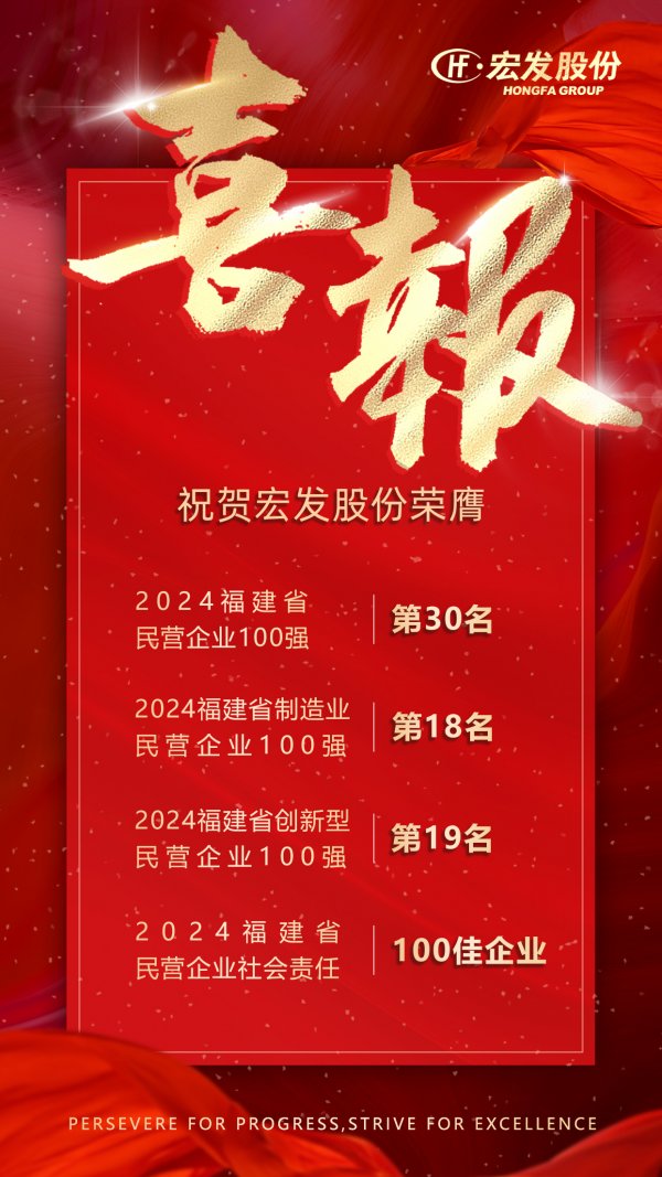 近日,福建省工商联发布“2024福建省民营企业100强”等5个榜单,宏发股份凭借良好经营成绩和强劲综合实力,荣登2024福建省民营企业100强第30名,福建省制造业民营企业100强第18名,福建省创新型民营企业100强第19名和福建省民营企业社会责任100佳企业。