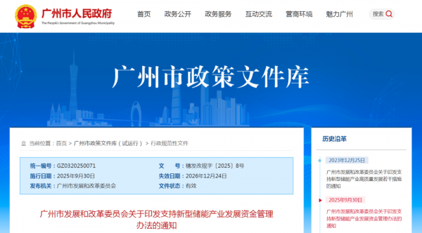 9月28日,广州市发展和改革委员会发布关于印发支持新型储能产业发展资金管理办法的通知。