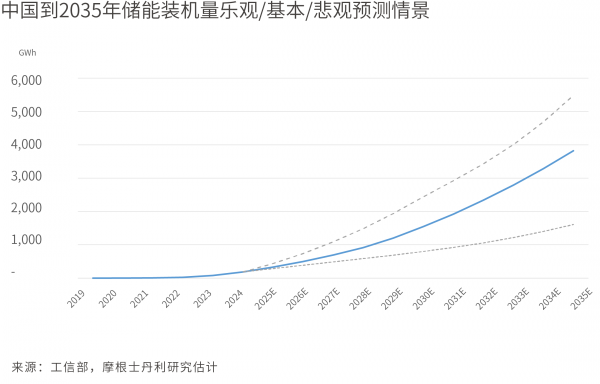此时,储能系统就像一座 “电力蓄水池”:在风光发电过剩时储存电能,在用电高峰时释放电力,完美解决了可再生能源的 “不稳定性” 痛点。据摩根士丹利测算,为支撑这一能源结构转型,中国储能系统累计部署量,到2030年将达1.54TWh、到2035年达3.82TWh,对应2025-2030年增量部署复合年增长率(CAGR)21%、2025-2035 年CAGR 14%。而在摩根士丹利的乐观预测中,到2030年,累计储能部署需要达到2.7TWh,2035年部署量甚至可能达到5TWh,增长潜力堪称恐怖。
