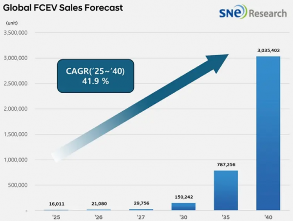 根据SNE Research的市场分析,全球燃料电池汽车(FCEV)市场预计将实现快速增长,从2025年约1.6万辆扩大至2040年的303万辆,在预测期内的复合年增长率(CAGR)约为41.9%。