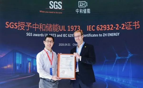 据全球液流电池网获悉,4月1日,第十四届储能国际峰会暨展览会(ESIE2026)在北京盛大启幕。展会现场,国际权威检测认证机构SGS为深圳中和储能科技有限公司举行颁证仪式,授予FStack系列液流电堆UL 1973、IEC 62932-2-2双重国际认证,成为本届展会储能安全与合规领域的重要亮点。