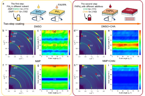 研究表明,溶剂体系在结晶前期通过形成特定的中间相结构,为晶体生长提供了初始取向模板。DMF/DMSO体系,倾向于生成与(111)晶面匹配的PbI2·DMSO络合物。DMF/NMP体系,更易形成与(100)晶面对应的PbI2·(DMF/NMP)复合相。