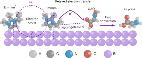 该研究开发出一种用于电化学合成甘氨酸的高性能催化剂,揭示了由离子液体自由基介导的新型电子转移机制,为加速催化过程中的电子转移提供了新策略,有望用于发展更多新反应路线。